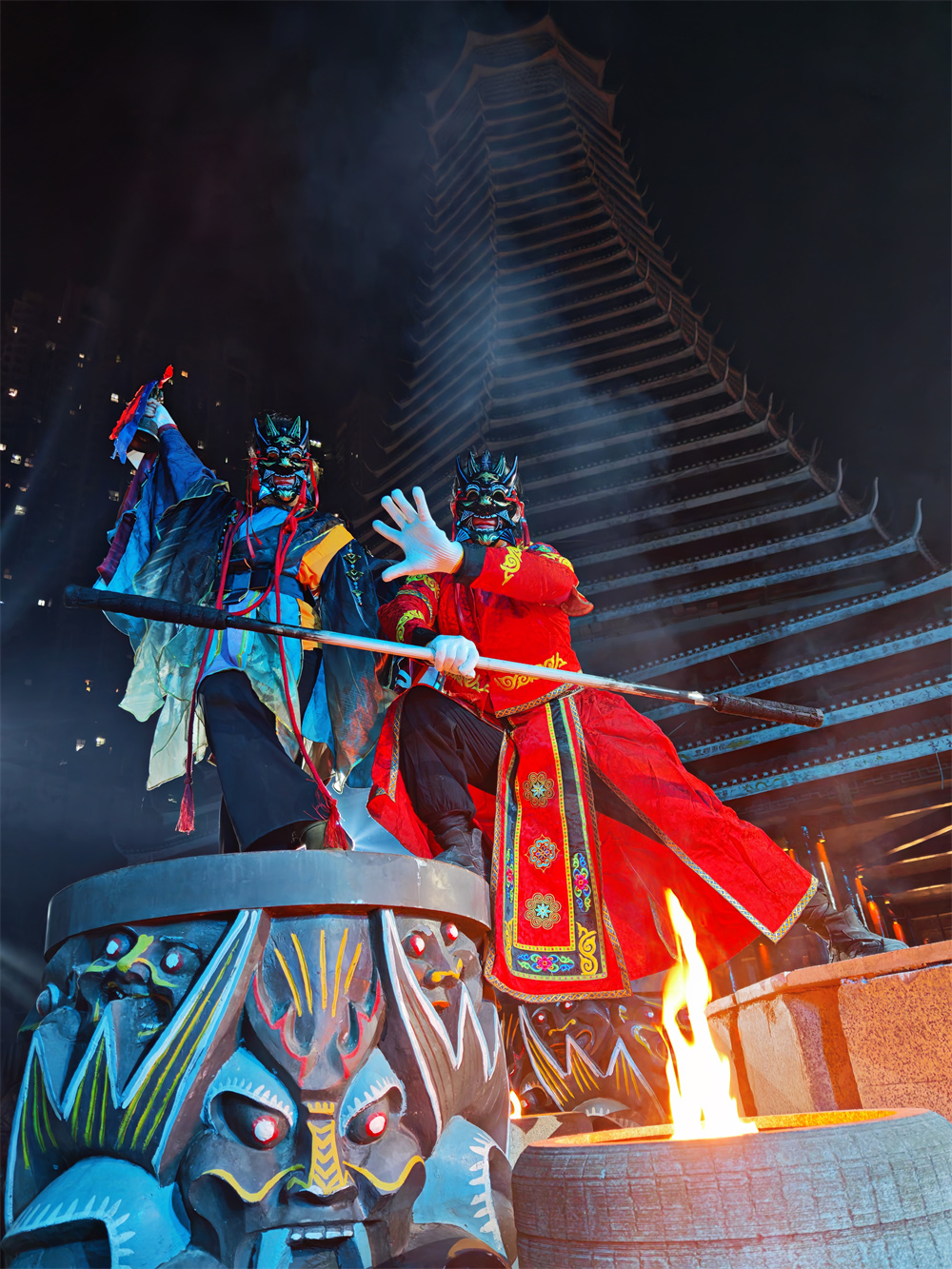 4月18日晚,贵阳市南明区花果园苗疆秘境景区内歌舞喧闹、傩面舞动,一场以非遗文化为核心的沉浸式狂欢——“爽爽贵阳嗨翻天·苗疆……
